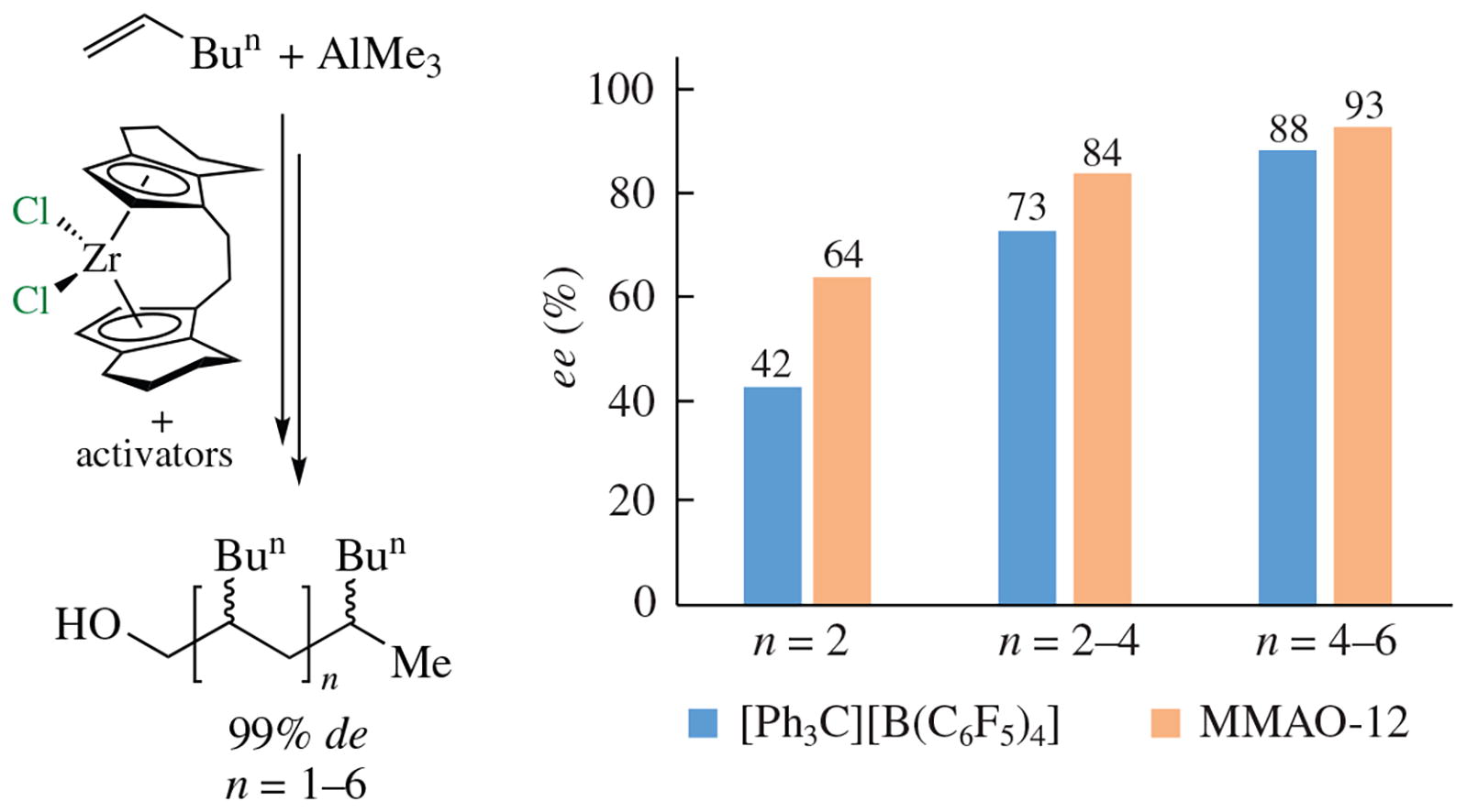 Enantiomerically enriched (38-93% ee) diastereomerically pure (99% dr) functionally substituted dimers and oligomers with the starting Me-group were obtained by the reaction of 1-hexene with AlMe3 in the presence of enantiomerically pure dichloro[(R,R)-ethylenebis(4,5,6,7-tetrahydroinden-1-yl)]- zirconium(IV). Modified methylaluminoxane MMAO-12 as the activator was somewhat superior to boron-containing compound [Ph3C][B(C6F5)4].