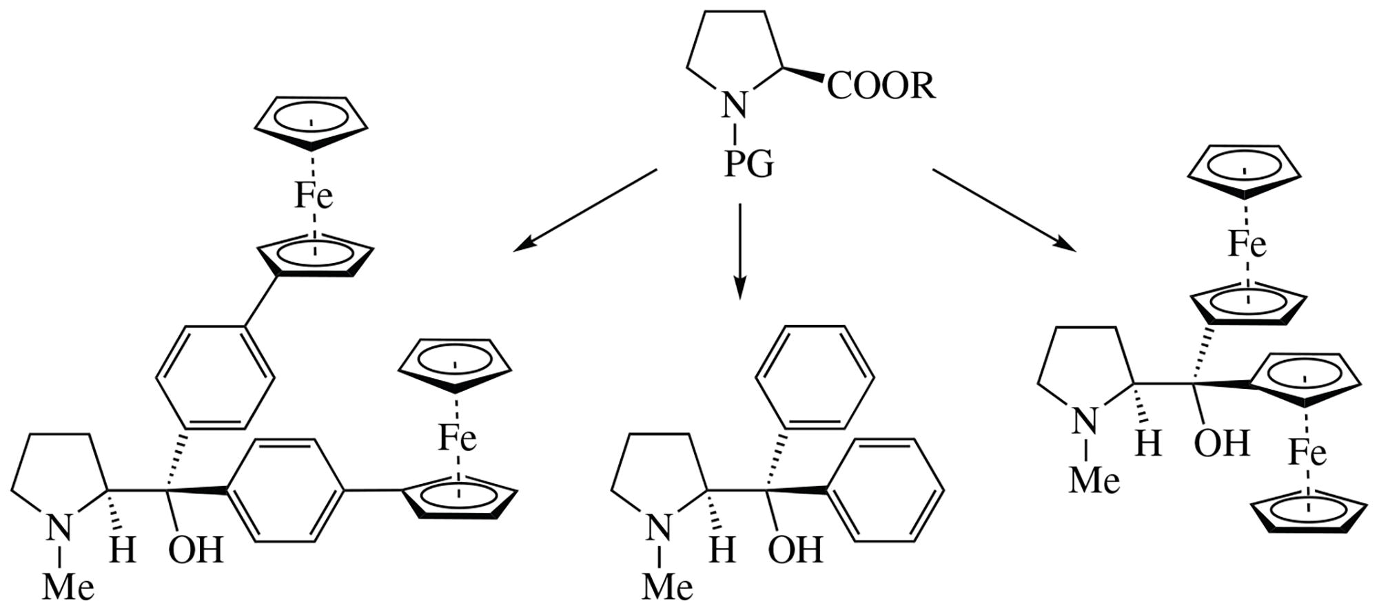 Syntheses of new ferrocenyl-containing tertiary alcohols derived from l-proline were developed. In these alcohols,two ferrocenyl groups are bonded at prolinol moiety directly or through p-phenylene spacer. Specific features for the ferrocene Grignard reagents were discovered.