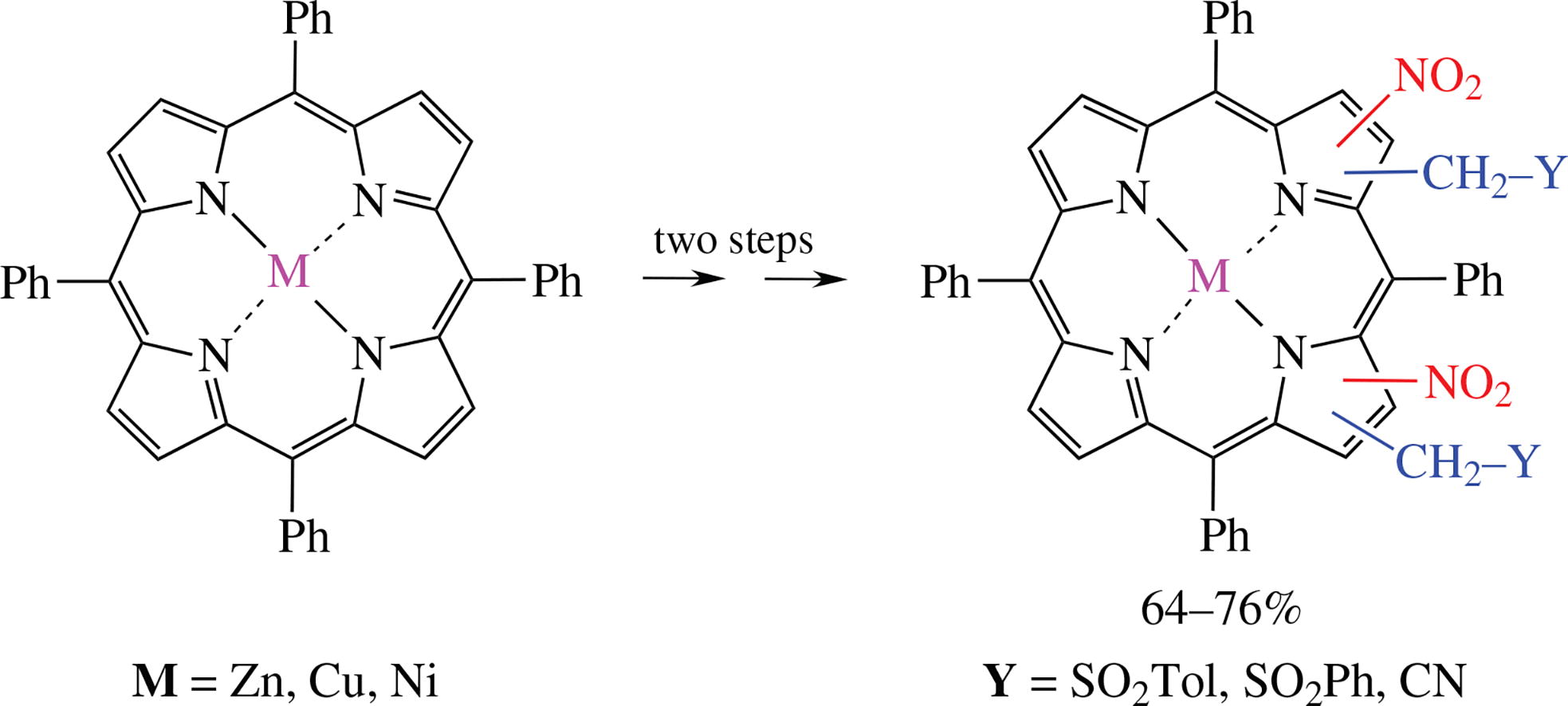 The two-step synthesis of porphyrin derivatives, exhaustively bbb-substituted at the ‘Eastern half’, starting from meso- tetraarylporphyrin chelates (Cuii, Znii, Niii) upon their reaction with nitric acid, is described. The intermediates obtained (mainly dinitro-derivatives) in the reaction with carbanions bearing a leaving group X at the reactive centre give tetrasubstituted at the bbb-positions products, the ones of vicarious nucleophilic substitution of hydrogen. The products seem to be potential anticancer PDT agents, practically unavailable by other methods.