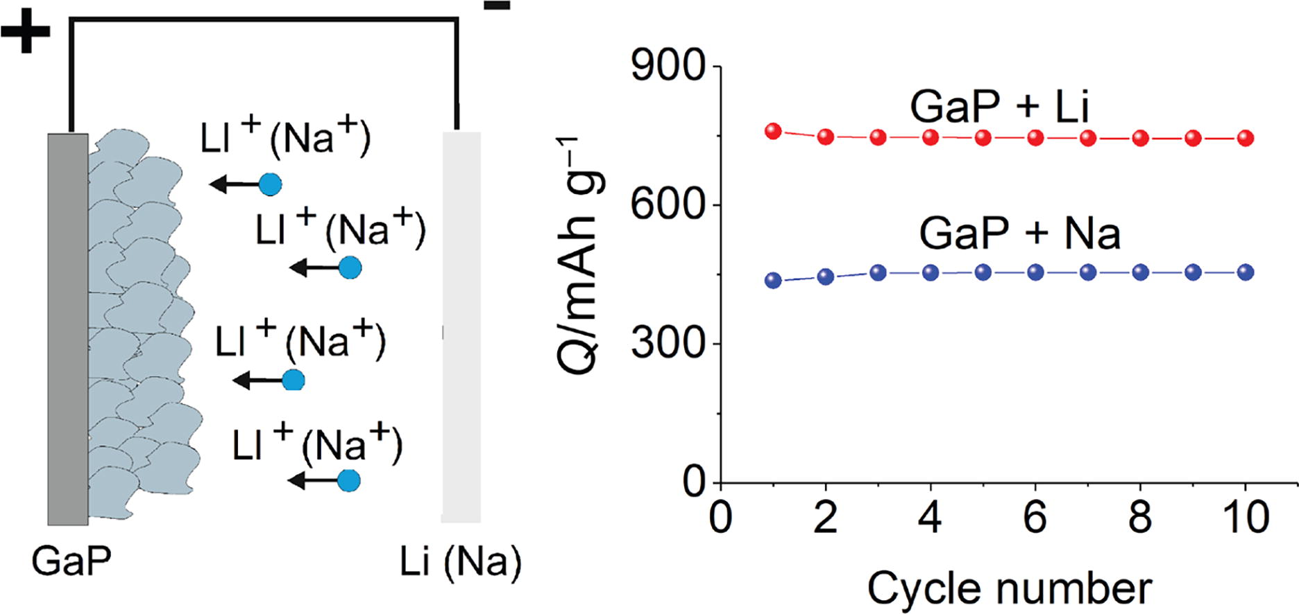 Gallium phosphide (GaP) was synthesized and studied as an anode functional material for lithium-ion and sodium-ion batteries. Electrochemical interaction of GaP with lithium and sodium was compared. The reversible capacity of GaP toward lithium and sodium insertion was found to be about 760 and 465 mAh g-1, respectively.