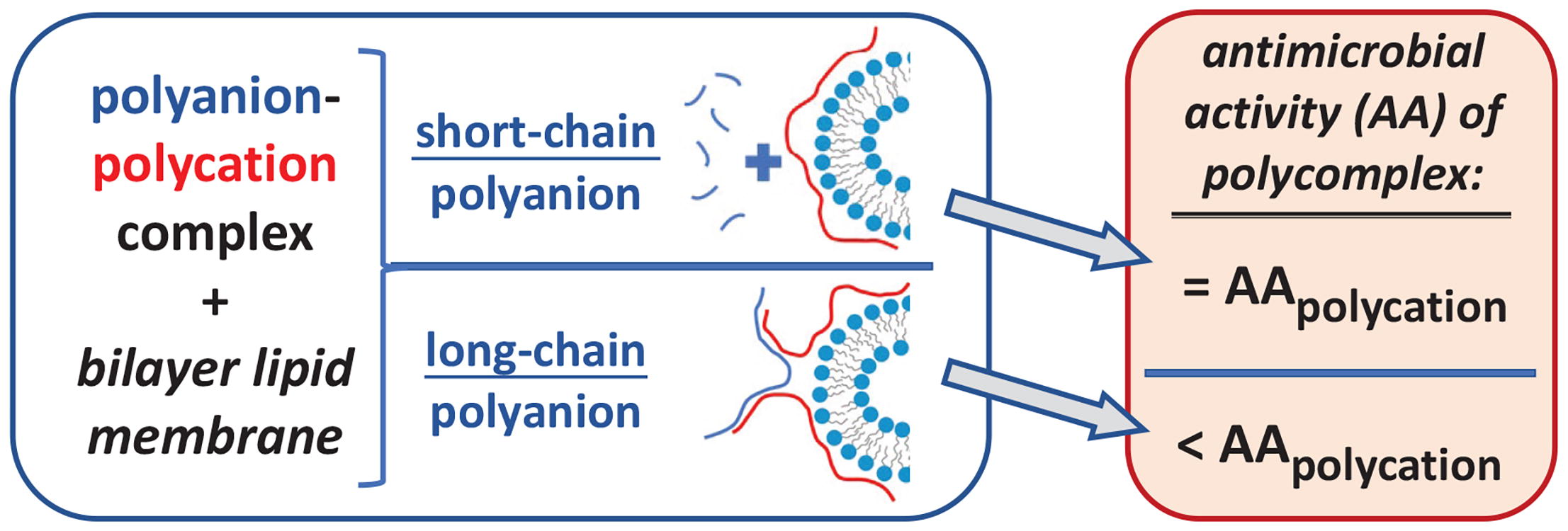 Cationic poly(diallyldimethylammonium chloride) forms nonstoichiometric positively charged interpolyelectrolyte complexes (IPECs) with short- and long-chain anionic sodium polyacrylate. When added to anionic liposomes, the short-chain polyanion IPECs dissociate and the free polycation binds to the liposomes, whereas the long-chain polyanion IPECs bind to the liposomes as a whole. These results correlate with the antimicrobial activity of IPECs, thereby highlighting the important role of polymer molecular weight in the cellular response to IPEC binding.