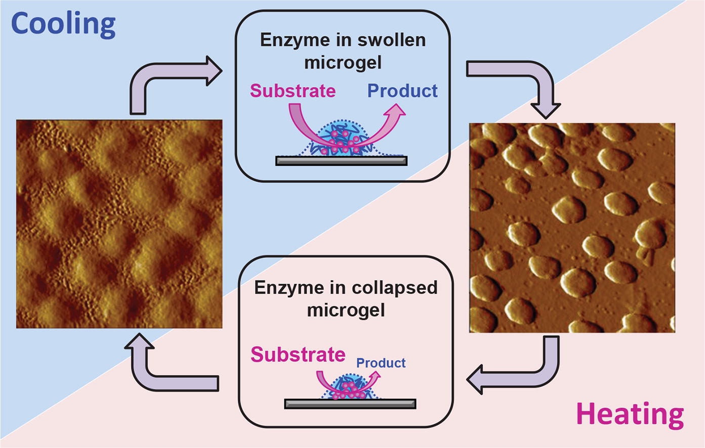 Microgel-enzyme coatings were fabricated onto graphite substrates (highly oriented pyrolytic graphite or graphite- based screen-printed electrodes) via two-stage sequential procedure, which consists in adsorption of a pH- and temperature-sensitive copolymer microgel, followed by electrostatic immobilization of glucose oxidase into the microgel film. The microgel-enzyme coatings were examined by means of atomic force microscopy showing remarkable coverage of graphite surface by the microgels and visualizing the immobilized enzyme. Finally, amperometry was applied to reveal the effect of the polymeric (microgel) matrix on temperature behavior of glucose oxidase in the microgel- enzyme coatings.