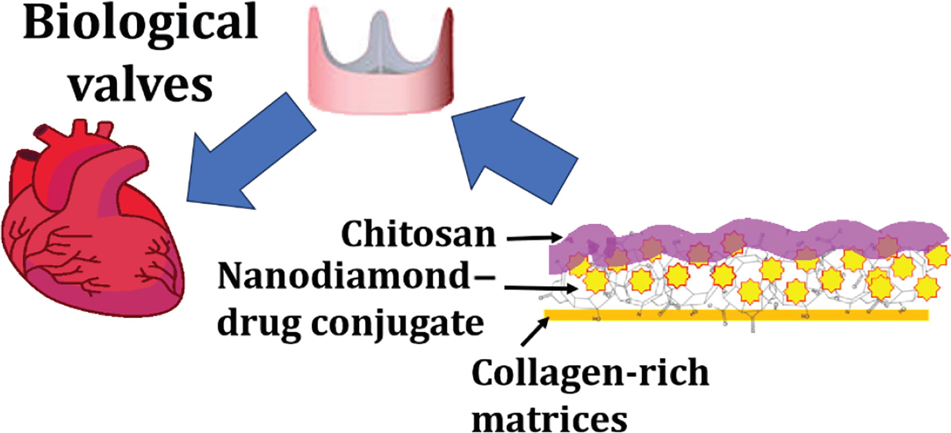 Multicomponent coatings of collagen-rich matrices of bovine pericardium were prepared from nanodiamonds and antibiotics, namely, amikacin, levofloxacin and chitosan. Preservation of the multilayers that consist of nanodiamonds, antimicrobial agents and chitosan on the material surface and preventing the calcification of the material were revealed.