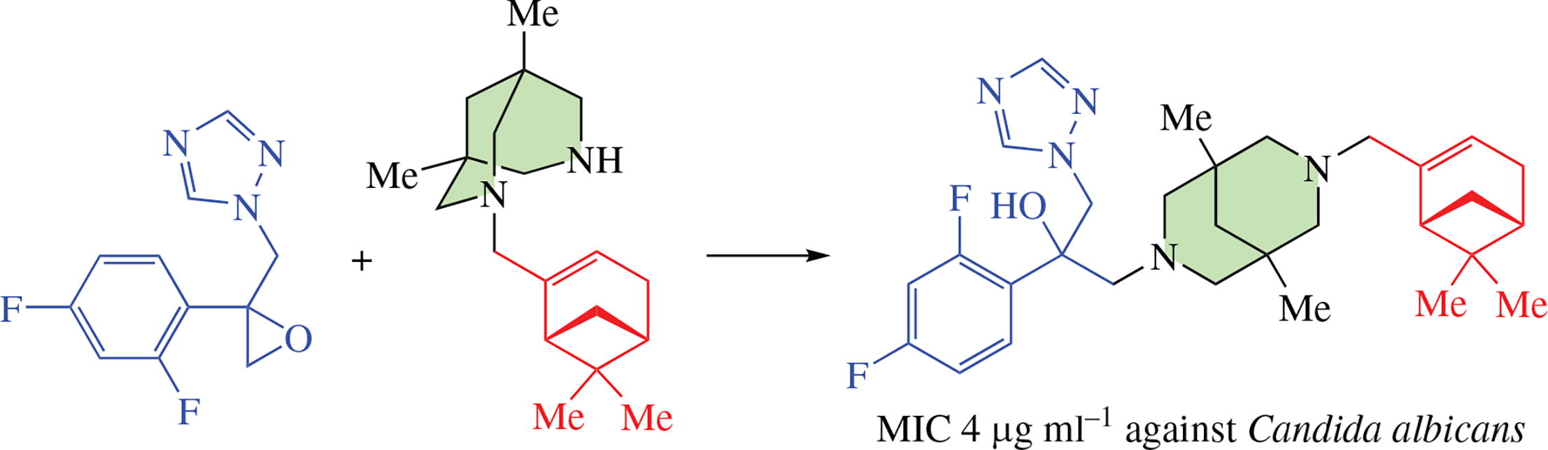 A new monoterpene-azole hybrid containing myrtenyl- bispidine moiety, 2-(2,4-difluorophenyl)-1-(7-{[(1R,5S)-6,6- dimethylbicyclo[3.1.1]hept-2-en-2-yl]methyl}-1,5-dimethyl- 3,7-diazabicyclo[3.3.1]non-3-yl)-3-(1H-1,2,4-triazol-1-yl)- propan-2-ol was prepared in six steps with 55% overall yield. The compound was tested against a number of Candida spp. fungi and found to be active against Candida albicans. Molecular docking suggested possible inhibition of lanosterol 14α-demethylase (CYP51), a membrane enzyme targeted by azole antifungals.
