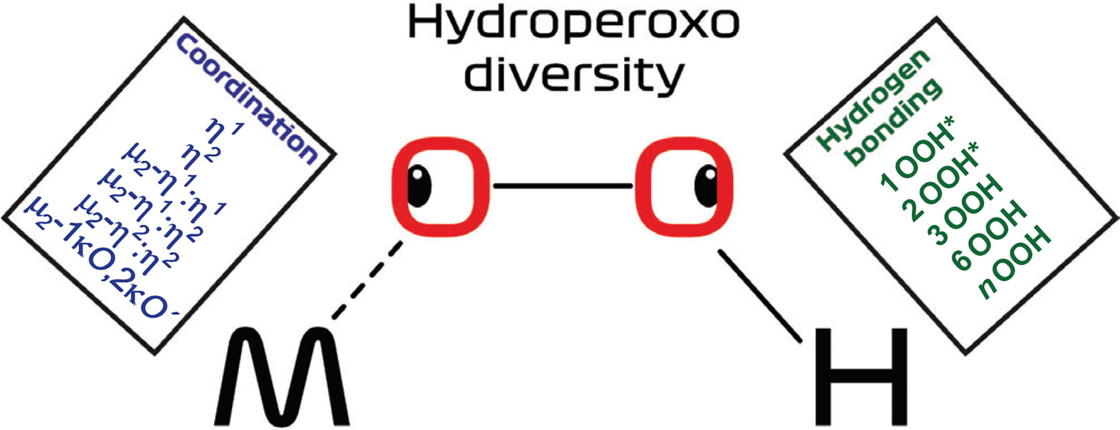 Hydroperoxo complexes, that is coordination compounds with directly bound hydroperoxo ligands OOH−, are encountered and applied in various fields such as catalytic oxygenations and functional material precursors. This focus article spotlights a hydroperoxo ligand as a key moiety providing the reactivity of these complexes and stabilization of their crystal structures through hydrogen bonding. The diversity of hydroperoxo coordination types and hydrogen-bonded motifs is demonstrated for the crystalline organoelement and inorganic hydroperoxides presented in the structural databases.