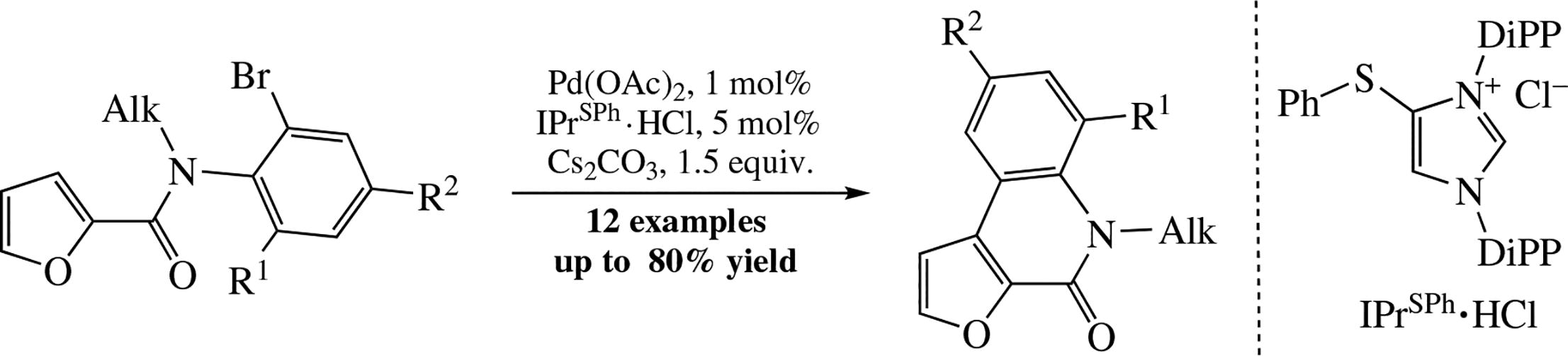 An efficient procedure for the preparation of furo[2,3-c]-quinolin-4(5H)-ones from 2-furoic acid N-(o-bromoaryl)- amides via selective intramolecular C(3)-H arylation of the furan nucleus involves the catalysis by a Pd/NHC system generated in situ from Pd(OAc)2 and readily available IPrSPh HCl proligand. A series of novel furo[2,3-c]quinolin-4(5H)-ones were prepared in 65-80% isolated yields.