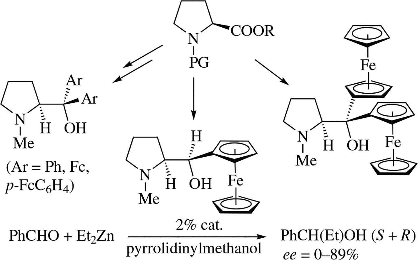 New ferrocenyl-containing diastereomeric secondary alcohols derived from L-proline of (ferrocenyl)(pyrrolidin-2-yl)methanol chemotype were synthesized. Their crystal and molecular structure was explored. The prepared chiral secondary and tertiary alcohols in which hydroxy group is sterically hindered by ferrocene substituents show asymmetric induction effect in reaction between diethylzinc and benzaldehyde.