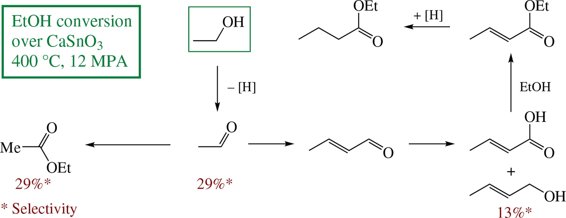 Ethanol over calcium stannate (CaSnO3) catalyst under supercritical conditions (400 °C, 120 atm) is transformed mainly into ethanal, ethyl acetate and 2-buten-1-ol. The process is accompanied by crystallization of the amorphous catalyst.