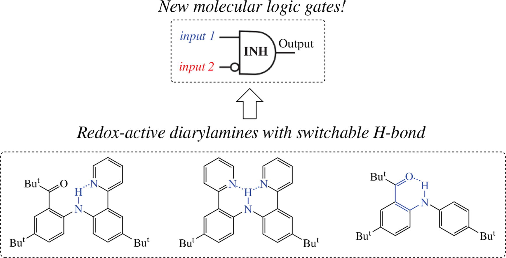 New ortho-substituted diarylamines prone to different types of the intramolecular H-bonding (IMHB) were obtained. In-depth NMR, IR and voltammetry study allowed selecting the amine that demonstrates stable reversible switching of the IMHB bond under the external stimuli, which can be used for the logic gate construction.