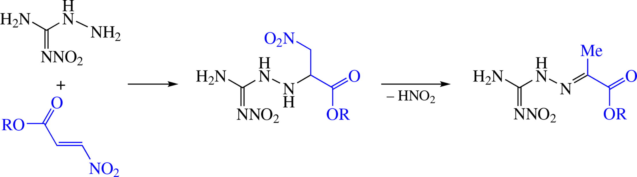 The reactions of 1-amino-2-nitroguanidine with 3-nitro- acrylates afford aza-Michael adducts. The latter when refluxed in an aqueous alkaline medium undergo elimination of nitrous acid followed by shift of the resulting C=C bond into C=N position giving finally N-substituted alkylpyruvate hydrazones. These compounds can also be prepared in a one-pot procedure; NMR spectroscopy and X-ray diffraction analysis confirmed the existence of the obtained hydrazones as E-isomers.