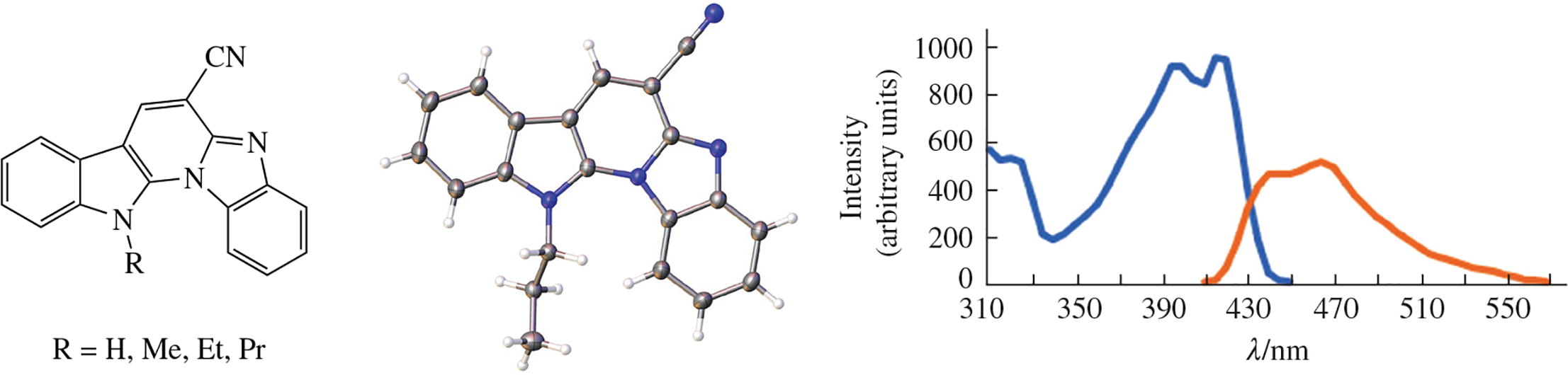 The structure of representatives of a new heterocyclic system, 12H-benzimidazo[1',2':1,6]pyrido[2,3-b]indole-6-carbonitriles, potential bioactive compounds, is elucidated by X-ray diffraction. The compounds exhibit luminescence in the blue region of the spectrum with quantum yields close to unity, which makes them promising phosphors for application in modern emitting devices.