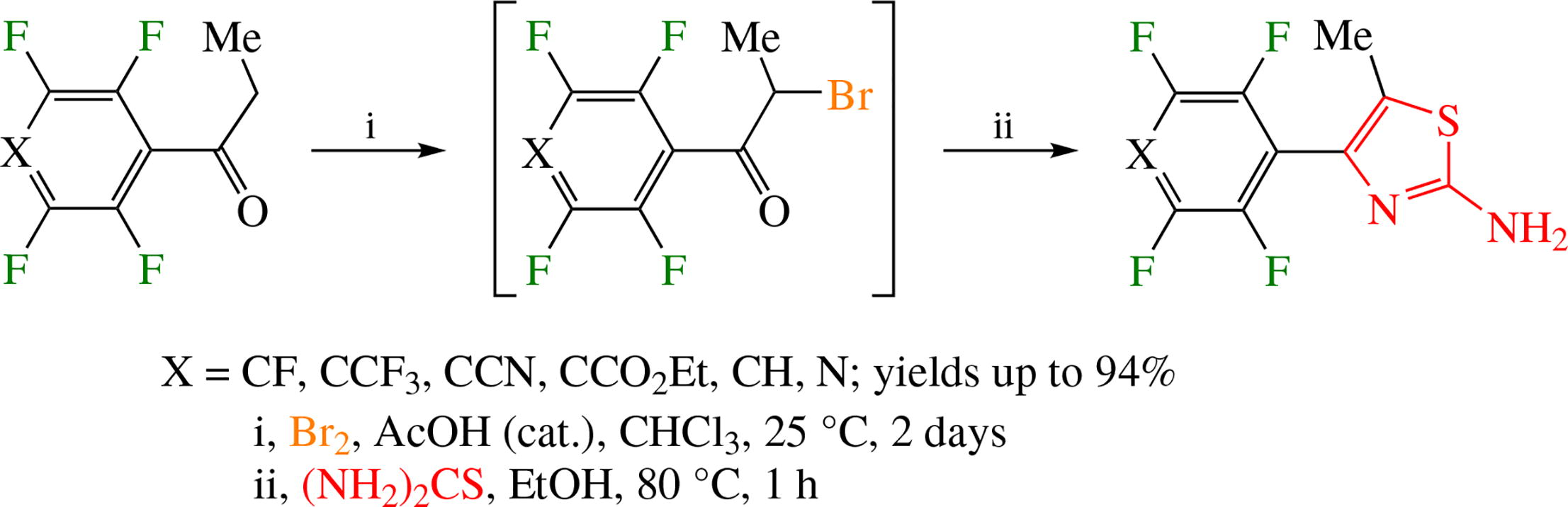 1-(Polyfluoroaryl)propan-1-ones were transformed into 5-methyl-4-polyfluoroaryl-1,3-thiazol-2-amines by a twostep reaction sequence involving formation of 2-bromo-1- (polyfluoroaryl)propan-1-ones under the acidic bromination conditions followed by heterocyclization with thiourea to finally afford new 5-methyl-4-polyfluoroaryl-1,3-thiazol-2- amines in high yields. 1,1'-(2,3,5,6-Tetrafluoro-1,4-phenylene)- dipropan-1-one was involved in the similar reaction to give a derivative containing two thiazole moieties.