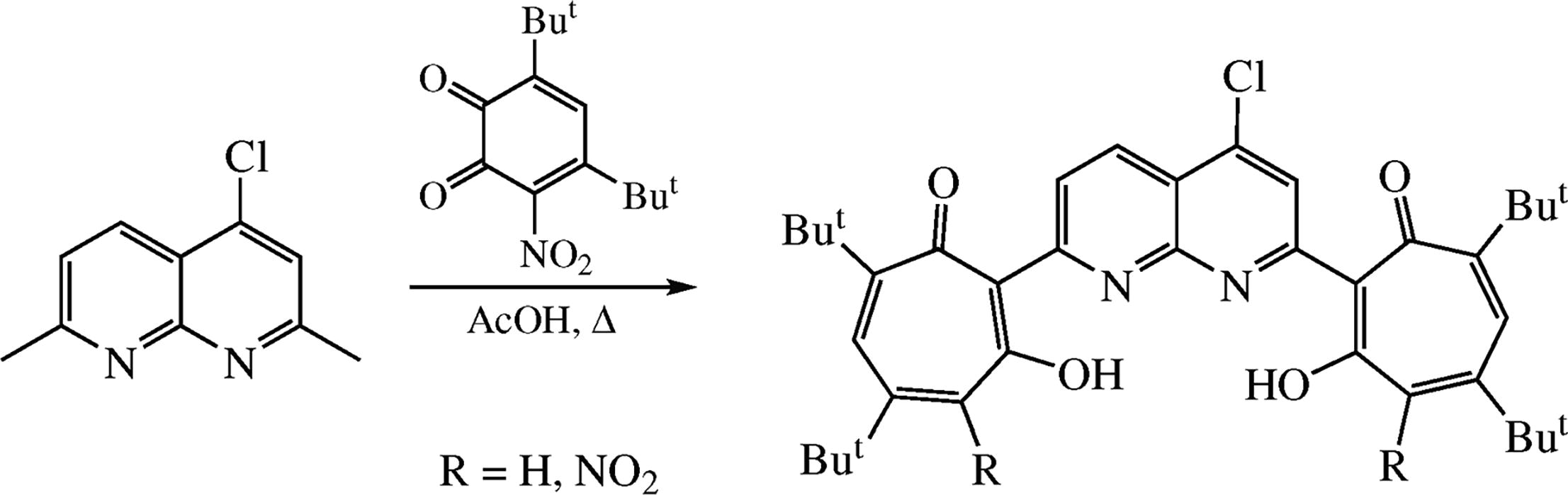 The acid-catalyzed reaction of 4-chloro-2,7-dimethyl- 1,8-naphthyridine with 4,6-di-tert-butyl-3-nitro-1,2-benzoquinone leads to new bis-1,3-tropolones. The crystal structures of the obtained bis-1,3-tropolones were determined by X-ray diffraction analysis; the spectral and luminescent properties, the structural and energy characteristics of the compounds were examined. The cytotoxic effect in vitro against cancer cell lines A549, H1299, HT29, CT26 and B16F10 was assessed using MTT assay.