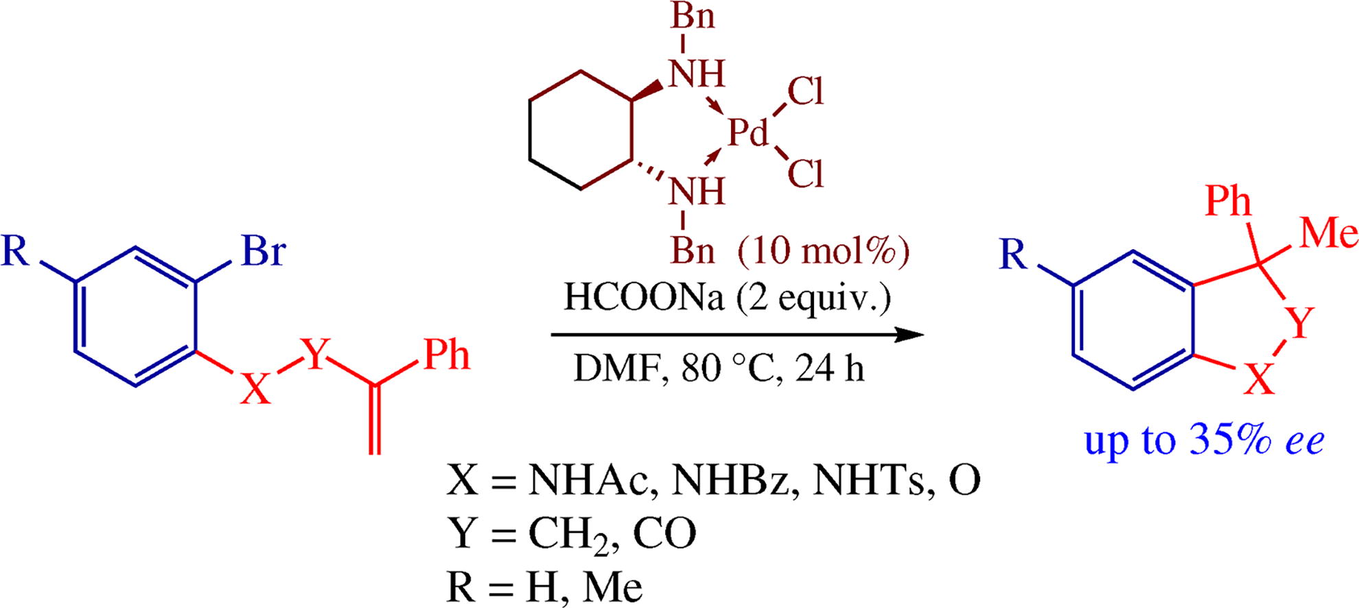 Palladium complexes with inexpensive and available vicinal diamines can serve as catalysts for the reductive Heck-type cyclization. o-Bromo-N-(2-phenylallyl)anilides are converted into the corresponding 3-methyl-3-phenylindolines, the analogous cyclization occurred for 2-bromo-4-methylphenyl 2-phenylallyl ether and N-(2-bromophenyl)-2-phenylacrylamides. The use of (1R,2R)-N,N’-dibenzylcyclohexane-1,2-diamine provides up to 35% ee of the indolines; this is the first case of asymmetric induction during the reductive Heck reaction involving diamine complexes.