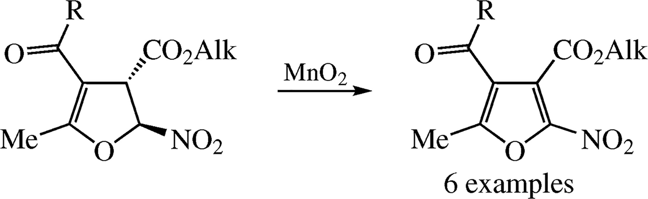 Nitrofuran-3-carboxylates were obtained by selective oxidation of trans-2,3-dihydronitrofuran-3-carboxylates with manganese dioxide in toluene. The structure of nitrofuran-3-carboxylates was characterized by physicochemical methods, including X-ray diffraction analysis.