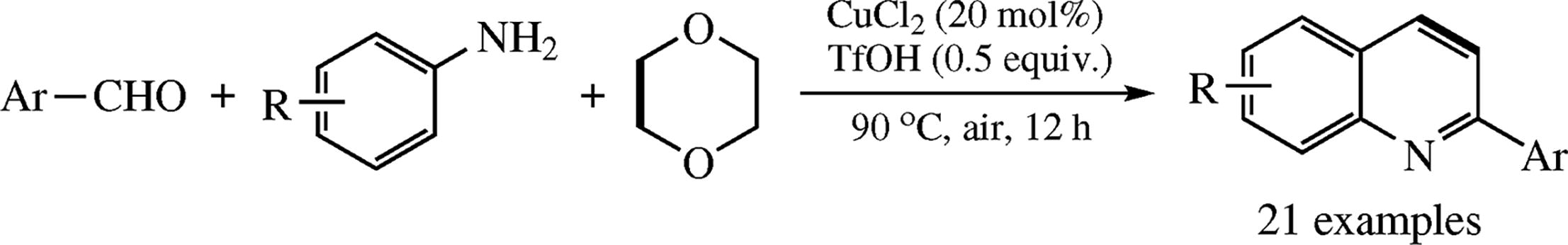 A copper-catalyzed three-component coupling sequence for 2-arylquinolines formation from aromatic aldehydes, anilines and 1,4-dioxane has been described. Unexpectedly, 1,4-dioxane served as a C2 building block in this transformation. This formal [4 + 2] approach provides rapid access to 2-arylquinolines with broad substrate scope under mild conditions.
