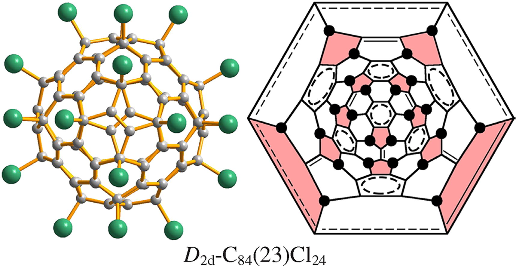 Chlorofullerene D2d-C84(23)Cl24 was prepared by chlorination of D2d-C84(23) with VCl4 or SbCl5 at 320-350 °C. An X-ray crystallographic study with the use of synchrotron radiation revealed the addition pattern of 24 Cl atoms stabilized by the formation of isolated C=C bonds and benzenoid rings on the carbon cage.