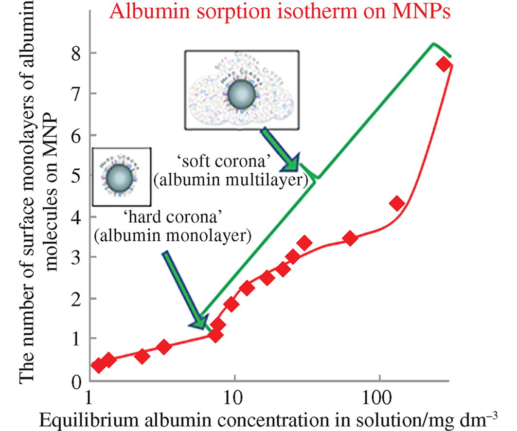 The patterns of interaction of the nanoparticles surface with protein components of biosystems have been studied on the example of the interaction of magnetic nanoparticles of the core-shell structure with albumin. Data on particle sizes and their spectra in the visible region in the presence of different quantity of protein have been obtained and analyzed by sorption, spectral and dynamic light scattering methods and albumin sorption isotherms in various media. The formation of the ordered protein monolayer (so-called ‘hard corona’) with subsequent forming of the multilayer of a different structure (‘soft corona’) has been experimentally shown; it demonstrates that it is possible to computationally distinguish between mono- and multi-layer using data from sorption experiments.