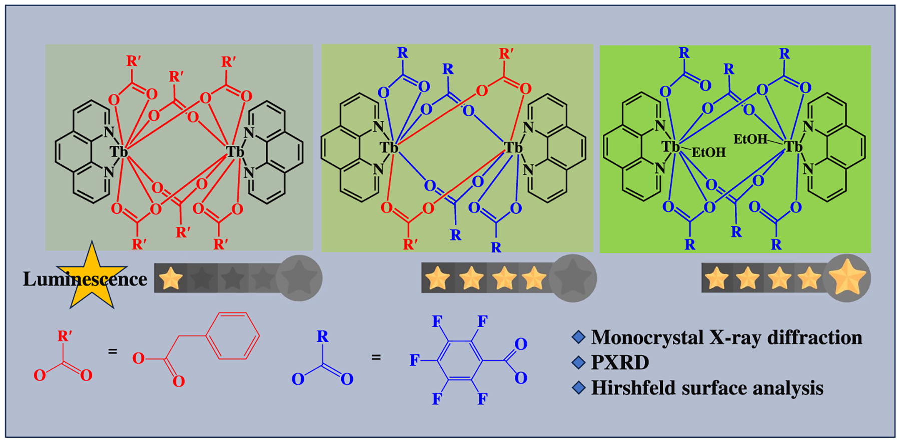 A complex of mixed carboxylate pentafluorobenzoate (pfb) and phenylacetate (PhAc), viz. [Tb2(phen)2(pfb)2(PhAc)4] (phen is 1,10-phenanthroline), where each rare earth element (REE) ion is simultaneously coordinated to pentafluorobenzoic and phenylacetic acid anions, was for the first time synthesized and structurally characterized. To evaluate the influence of the second type of anion on the structure and photoluminescent properties, compounds with phenylacetic acid anions [Tb2(phen)2(PhAc)6] and pentafluorobenzoic acid anions [Tb2(EtOH)2(phen)2(pfb)6] were obtained. A change in the composition of the compounds from the phenylacetic acid anion to pentafluorobenzoate led to a change in the geometry of the metal scaffold and the REE polyhedron, a rearrangement of the system of non-covalent interactions according to the Hirshfeld surface analysis, and enhanced luminescence.