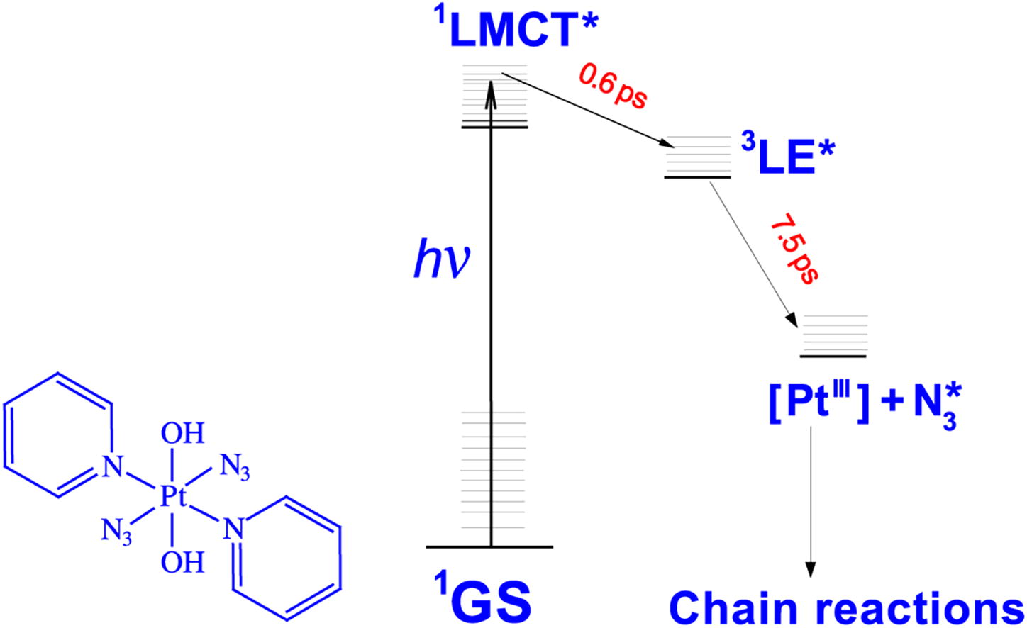 Using ultrafast transient absorption spectroscopy, primary photophysical processes in aqueous and acetonitrile solutions of the trans,trans,trans-[Ptiv (N3)2(py)2(OH)2] complex, which is interesting as a potential light-activated anticancer drug, were investigated. A mechanism for early photoprocesses has been proposed, including ultrafast intersystem crossing and reductive dissociation.