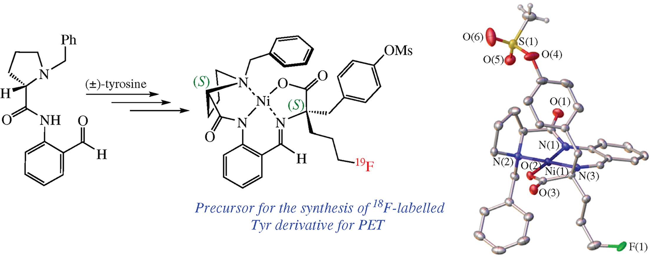New asymmetric metal-templated synthesis of enantiomers of (2S)- and (2R)-2-(3-[19F]fluoropropyl)tyrosine precursors were obtained based on a chiral NiII complex of the Schiff base derived from (S)-2-[N-(N’-benzylprolyl)amino]-benzaldehyde and racemic tyrosine in five steps. The free tyrosine derivatives which can be obtained upon decomplexation seem promising radiotracers for positron emission tomography imaging provided the introduction of 18F isotope.