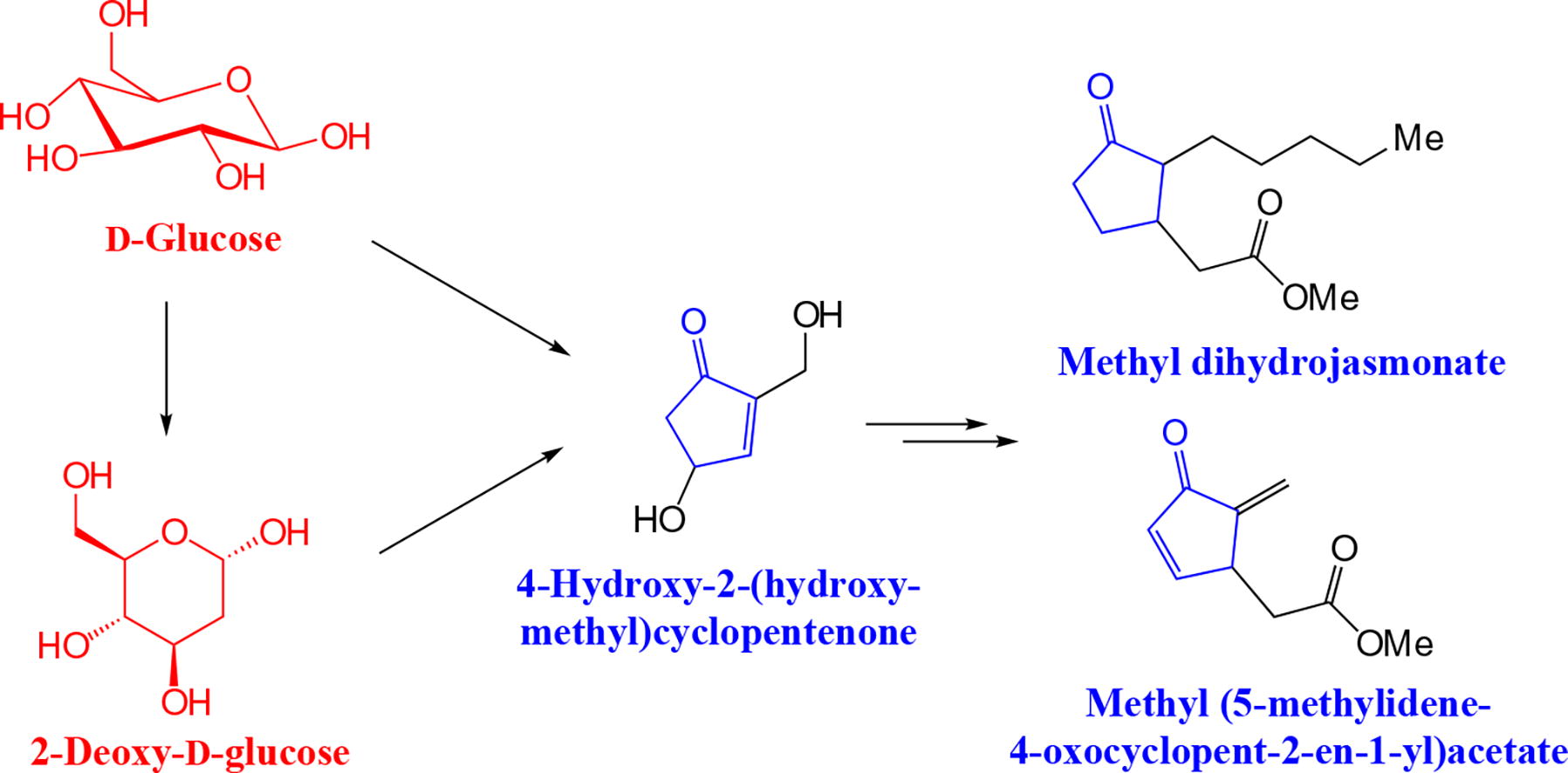 Methyl dihydrojasmonate and methyl (5-methylidene-4-oxocyclopent-2-en-1-yl)acetate were synthesized from 4-hydroxy-2-(hydroxymethyl)cyclopentenone, which, in turn, was obtained from D-glucose. The conditions for the key step, the Johnson-Claisen rearrangement, were optimized to get the maximum yield of the intermediate methyl 2-[2-methylene-3-oxo-5-(triisopropylsilyloxy)-cyclopentyl]acetate.