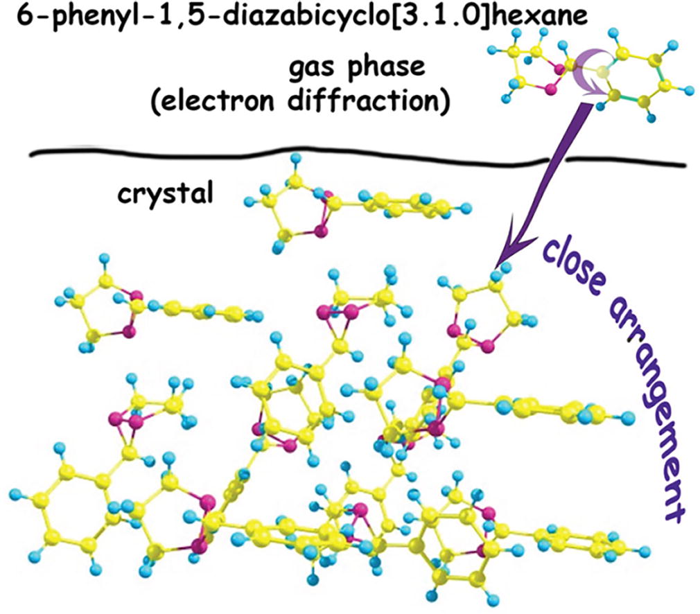 Based on gas electron diffraction experiments supported by quantum chemical simulations, the molecular structure of 6-phenyl-1,5-diazabicyclo[3.1.0]hexane (PhDBH) in the gas phase was determined, which is characterized by the puckering motion of the five-membered ring typical of bicyclo[3.1.0]- hexanes. It was found that the previously determined crystal packing is accompanied by a certain torsional twisting of the molecule, requiring activation energy. Based on the simulations of PhDBH clusters, it was shown that the energy is compensated by intermolecular interactions.