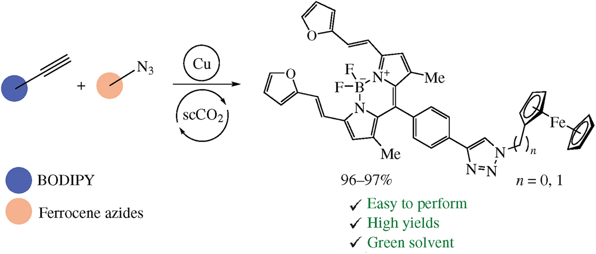 The copper-catalyzed azide-alkyne cycloaddition of BODIPY acetylene derivative and ferrocene azides in supercritical CO2 at 80 °C and 81 bar affords the corresponding triazole-containing BODIPY-ferrocene conjugates in high yields. The fluorescent and electrochemical properties of the compounds thus obtained were explored.