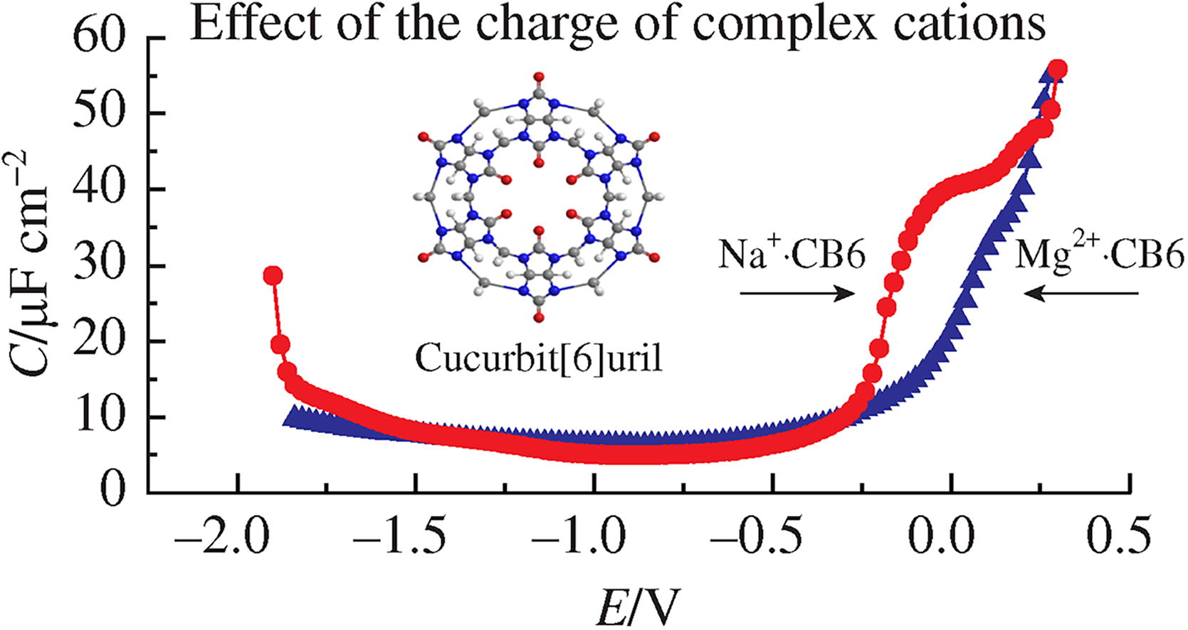 The behavior of cucurbit[6]uril at the electrode/solution interface in the presence of magnesium sulfate was investigated and quantified. It has been established that at the highest positive potential available for the adsorption of organic compounds, a structure is formed that consists entirely of neutral cavitand molecules.