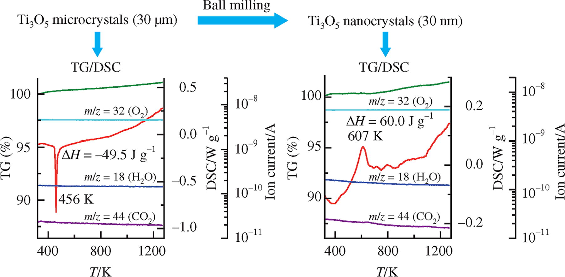 It was established that the particle size of titanium oxide β-Ti3O5 has a great influence on the processes of phase formation and the stability of particles during heating. It was shown that at a temperature of about 456 K, β-Ti3O5 micro crystals undergo a reversible first-order phase transition, in which the low- temperature β-Ti3O5 phase is transformed into the high-temperature λ- Ti3O5 phase, and at higher temperatures the β-Ti3O5 phase is partially oxidized to form the Magneli phase Ti4O7. It was found that β-Ti3O5 nanocrystals are unstable in an argon atmosphere and at temperatures above 400 K the β-Ti3O5 powder is oxidized.