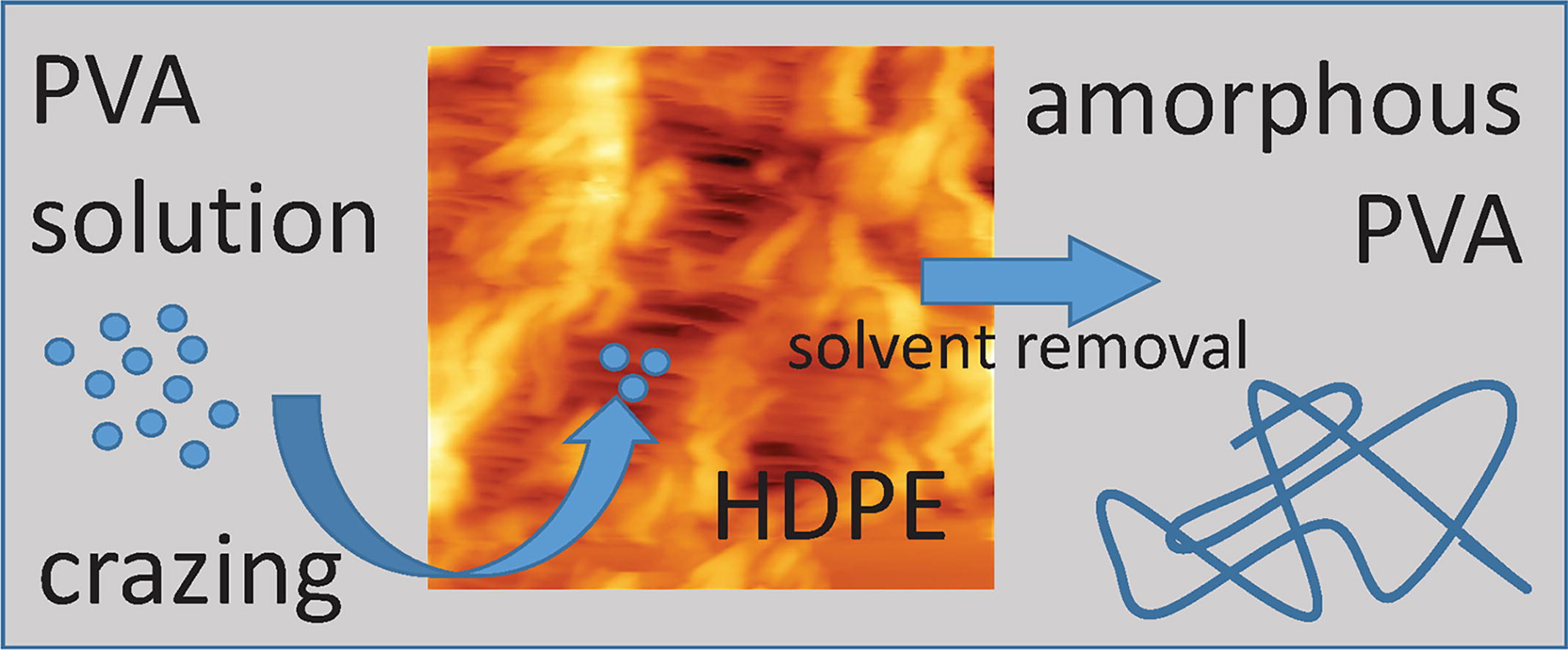 Poly(vinyl alcohol) (PVA) was incorporated into the mesoporous structure of high-density polyethylene (HDPE) directly upon the tensile drawing of films via crazing in water-ethanol PVA solutions. The structure and thermophysical properties of the HDPE-PVA nanocomposites were explored by differential scanning calorimetry and X-ray analysis. PVA was found to exist in an amorphized state within the mesoporous structure of the HDPE host matrix since its crystallization is prevented by the spatial confinements.