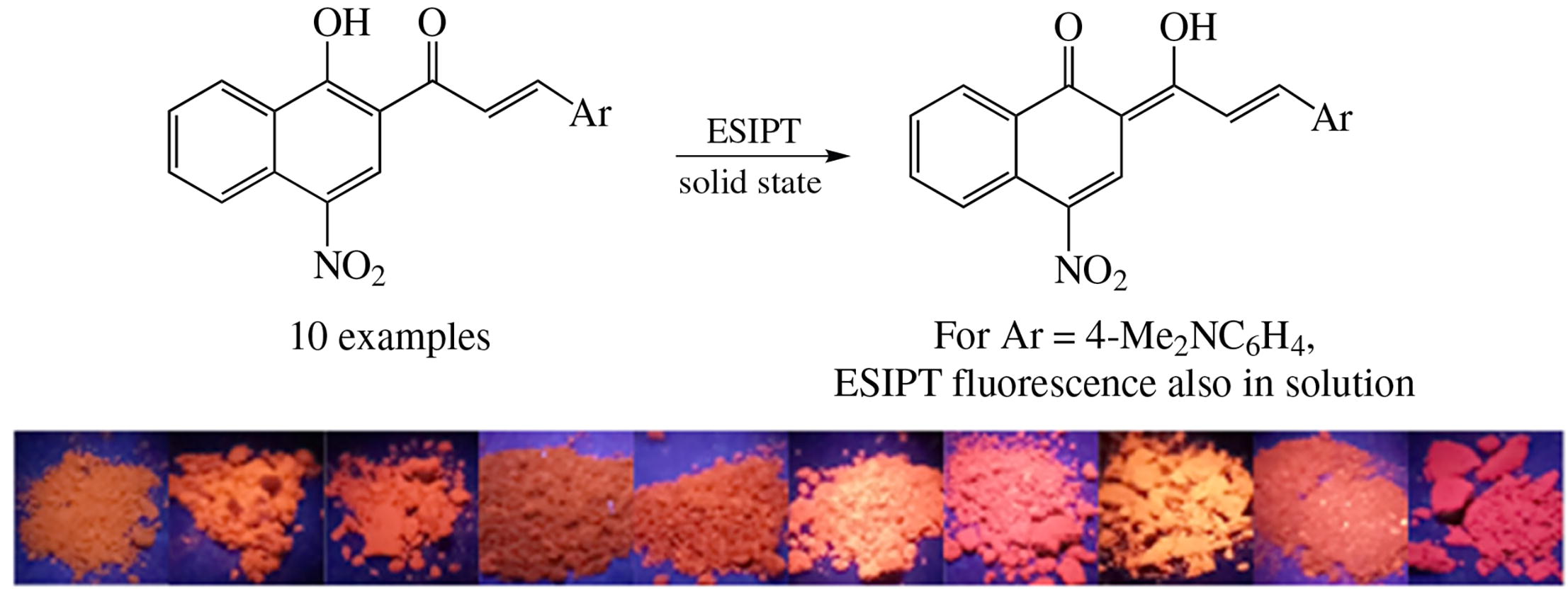 2’-Hydroxychalcones of 2-cinnamoyl-4-nitro-1-naphthol series were obtained by the condensation between 2-acetyl- 4-nitro-1-naphthol and benzaldehydes. The presence of the 4-positioned nitro group in the 1-hydroxy-2-naphthyl fragment contributes to the excited state intramolecular proton transfer (ESIPT) fluorescence of these 2’-hydroxy- chalcones in the solid state. Compound with dimethyl- amino substituent, 2-(4-dimethylaminocinnamoyl)-4-nitro- 1-naphthol, also demonstrates ESIPT in solution.