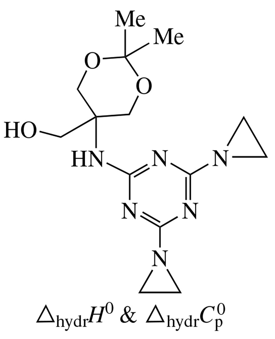 Thermochemical data on hydration of the well-established anticancer agent Dioxadet were obtained. Its enthalpies of solution and sublimation at various temperatures were determined calorimetrically, and on their basis the standard enthalpy (ΔhydrH0 = −154.6 ± 3.6 kJ mol−1) and the standard heat capacity (ΔhydrCp0 = 384 ± 80 J mol−1 K−1) of the transfer of the solute from the state of an ideal gas to an aqueous solution at infinite dilution at 298.15 K were calculated.