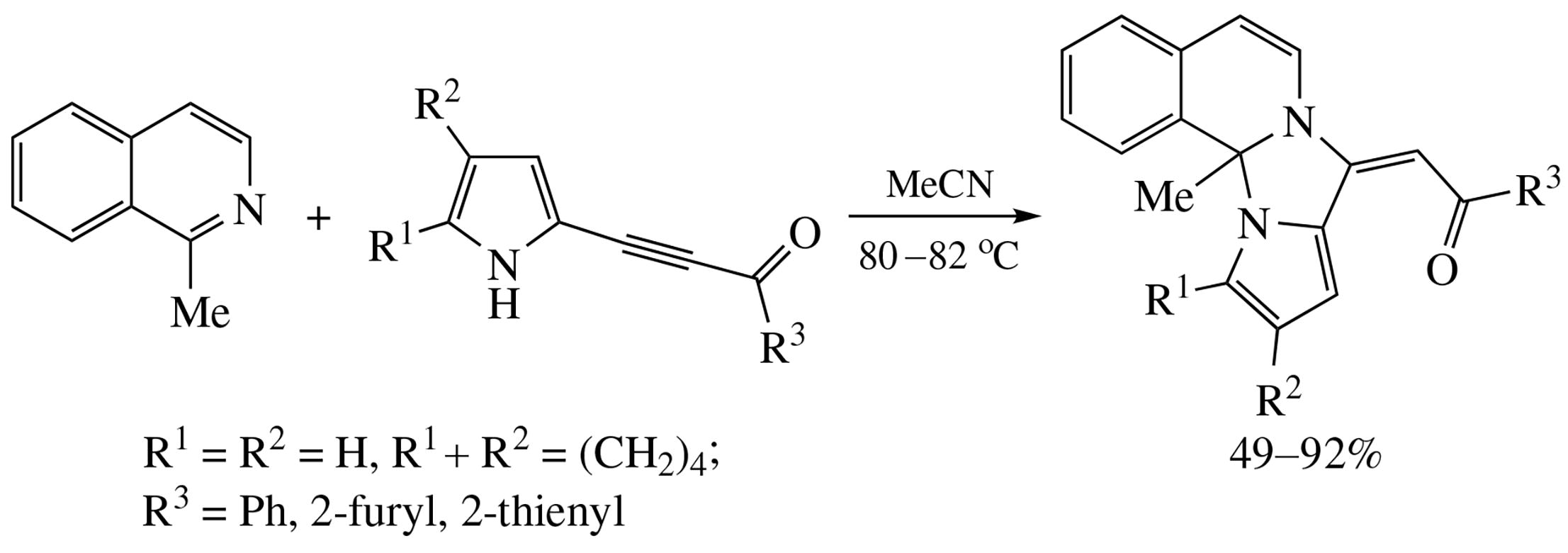 1-Methylisoquinoline undergoes stereoselective annulation with pyrrolylacetylenic ketones (MeCN, 80-82 °C) to provide (E)-acylethenylpyrrolo[1’,2’:3,4]imidazo[2,1-a]isoquinolines in up to 92% yield. In the case of 5-arylpyrrolylacetylenic ketones, instead of the above cyclization, the dimerization of the starting ketones to give dipyrrolopyrazines in 38 and 39% yields occurs.