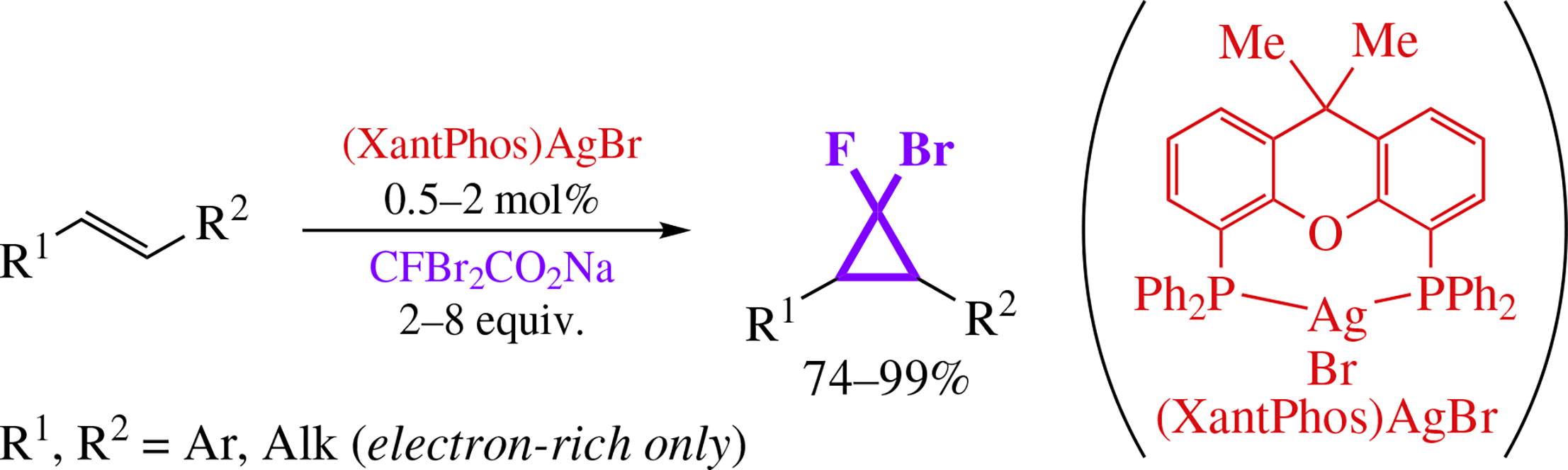 A silver phosphine complex (XantPhos)AgBr proved to be a cheap and readily accessible catalyst for bromofluoro- cyclopropanation of electron-rich alkenes with CFBr2CO2Na. Ozonolysis followed by treatment with NaHSO3 was shown to be an effective protocol to purify gem-bromofluoro- cyclopropanes from unreacted alkene precursors.