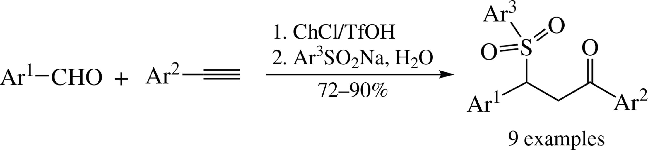 Acidic deep eutectic solvent was prepared from choline chloride and trifluoromethanesulfonic acid at room temperature. Reaction between aromatic aldehydes and arylacetylenes in this solvent gave chalcones whose in situ reaction with sodium arenesulfinates in water successfully provided γ-keto sulfones in good yields. This deep eutectic solvent could be easily recovered and reused for several runs.