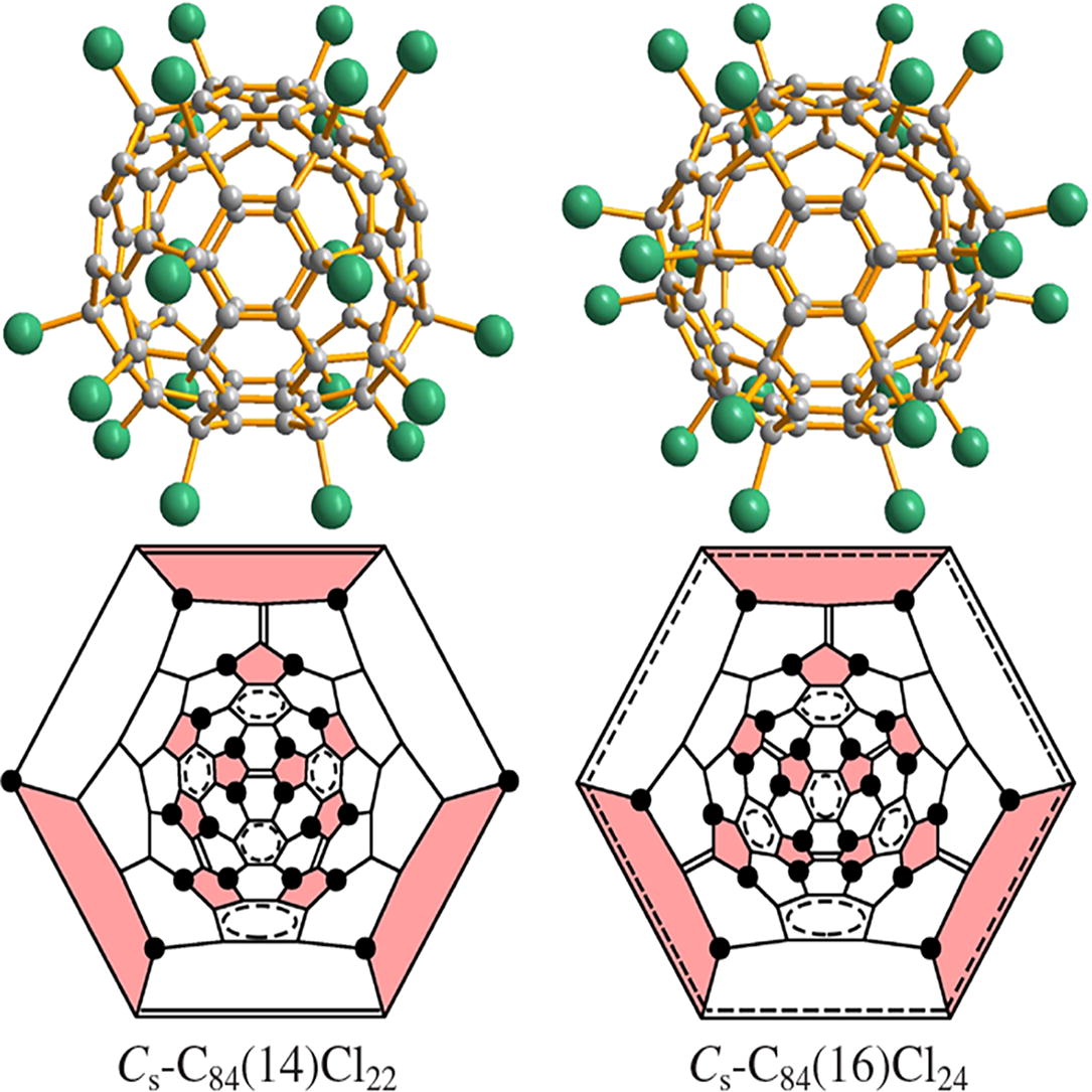 Chlorofullerenes C84Cl22,24 were obtained by chlorination of minor C84 isomers mixture with VCl4 at 330 °C. An X-ray crystallographic study with the use of synchrotron radiation revealed the presence of C84(11)Cl22, C84(14)Cl22, C84(16)Cl22, and C84(16)Cl24 in the same crystal.