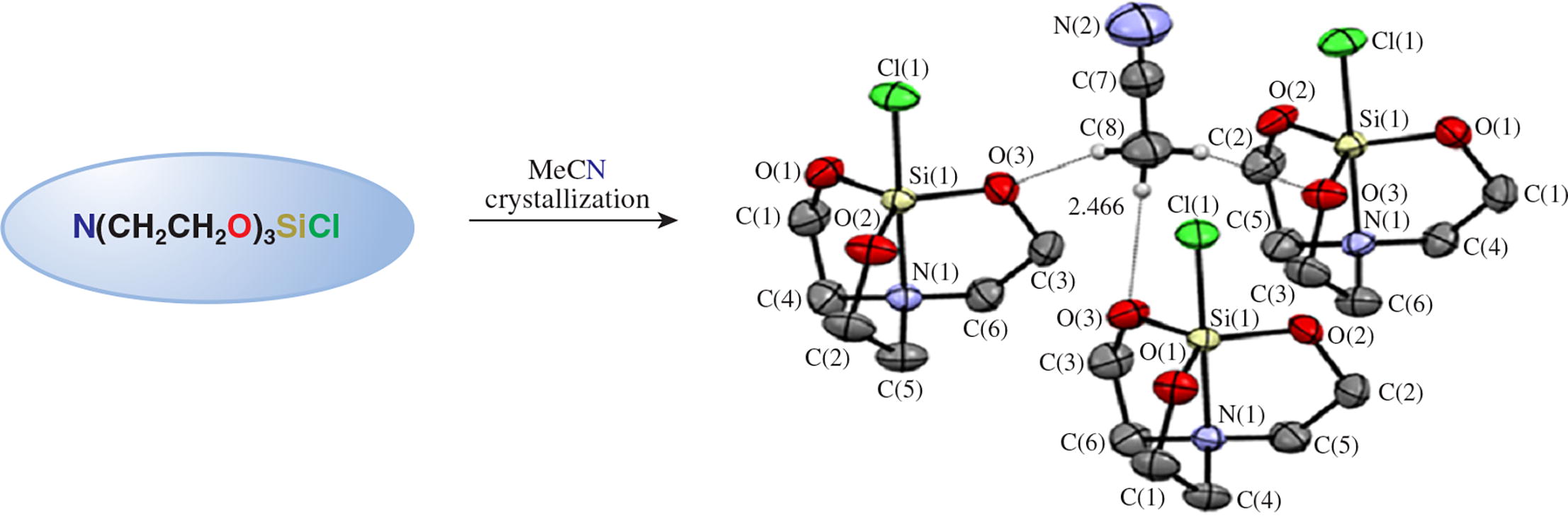 The single-crystal X-ray study of ClSi(OCH2CH2)3N showed the formation of a cluster of three silatrane molecules with one acetonitrile molecule featuring hypercoordinated Si atoms in a trigonal-bipyramidal coordination environment with O atom in the equatorial plane. A number of solid-phase structural parameters and the conformation of the fivemembered rings of 1-chlorosilatrane were thus clarified.