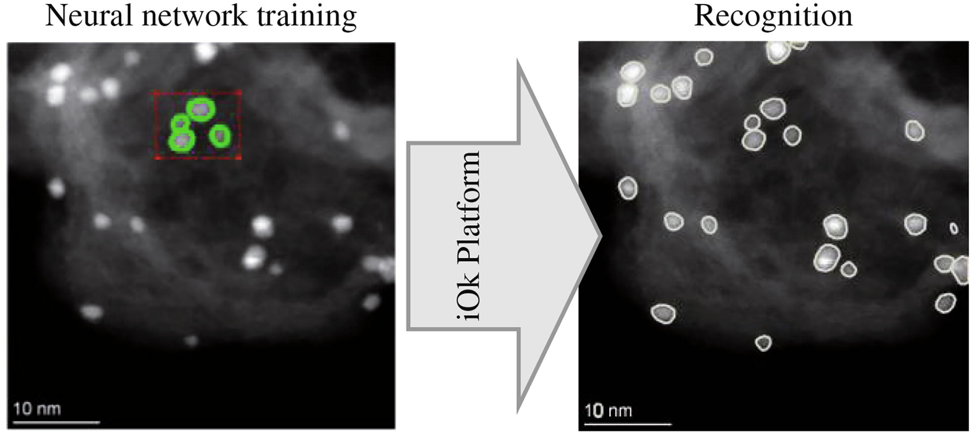 The universal, user-friendly online iOk Platform for automatic recognition of any type of objects in images based on deep machine learning is presented. Services aggregated in the iOk Platform significantly reduce the time spent on quantitative image analysis, decrease the influence of the subjective factor and increase the accuracy of the analysis by expanding the set of data that can be analyzed automatically. It is shown how the services can be used to analyze scanning transmission electron microscopy images obtained in heterogeneous catalysis studies, allowing for measurements of thousands of objects in an image, as well as simultaneous analysis of objects of different types, namely: nanoparticles and single sites.
