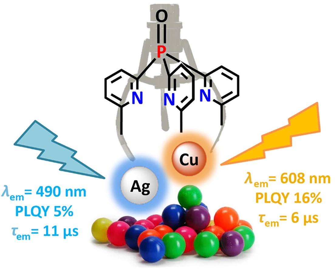 The interaction of tris(6-methyl-2-pyridyl)phosphine oxide (L) with equimolar amounts of [Cu(MeCN)4]PF6 or AgClO4 in acetonitrile produces scorpionate-like complexes [M(L)(MeCN)]X (M = Cu and Ag; X = PF6- and ClO4-). At ambient temperature, these compounds exhibit orange (λmax = 608 nm) or turquoise (λmax = 490 nm) photo-luminescence with a quantum yield up to 16% and lifetimes of microsecond order.
