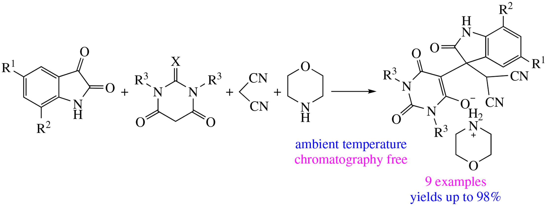 The new type of four-component tandem Knoevenagel-Michael reaction was found: isatins, barbituric acids, malononitrile and morpholine at ambient temperature and without catalysts selectively form new non-symmetrical ionic scaffold, namely, morpholin-4-ium 5-(3-dicyanomethyl-2-oxoindolin-3-yl)-1,3-dimethyl-2,6-dioxo-1,2,3,6-tetra-hydropyrimidin-4-olate derivatives, in 80-98% yields. Their structure was confirmed using 2D NMR such as 1H-1H COSY, 1H-13C HSQC, and 1H-13C HMBC correlation experiments. The products seem promising as they contain three different pharmacologically active heterocyclic rings.