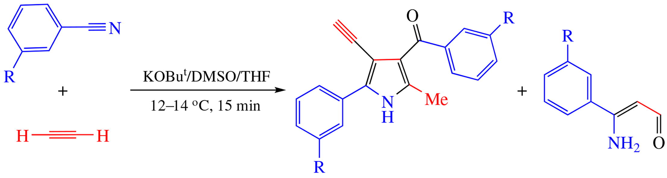 Benzonitriles react with acetylene gas (12-14 °C, 15 min) in the KOBut/DMSO/THF system to afford 2-aryl-3-ethynyl-4-aroyl-5-methylpyrroles and arylaminoacroleins that result from self-organization (in the presence of trace water) of two molecules of benzonitrile with three molecules of acetylene and one molecule of benzonitrile with one molecule of acetylene, respectively.