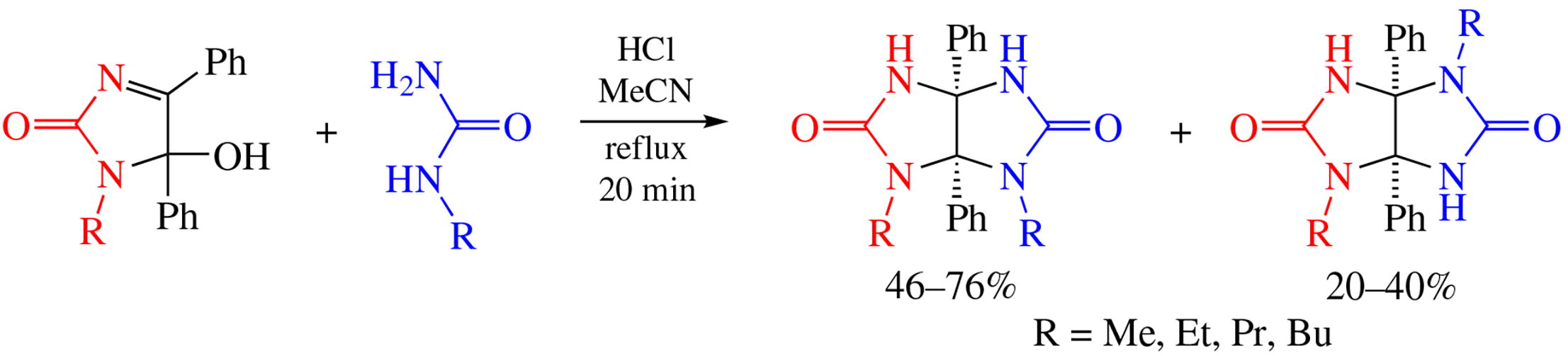 New regioselective reaction of 1-alkyl-5-hydroxy-4,5-diphenyl-1H-imidazol-2(5H)-one with alkylureas gives predominantly 1,6-dialkyl-3a,6a-diphenylglycolurils along with minor quantities of the 1,4-isomers. In case of propyl homologues, co-crystal of 1,6/1,4-dipropyl glycolurils would precipitate. Based on the analysis of the crystal packing of the products, new type of supramolecular chains for 1,4-disubstituted glycolurils has been identified.