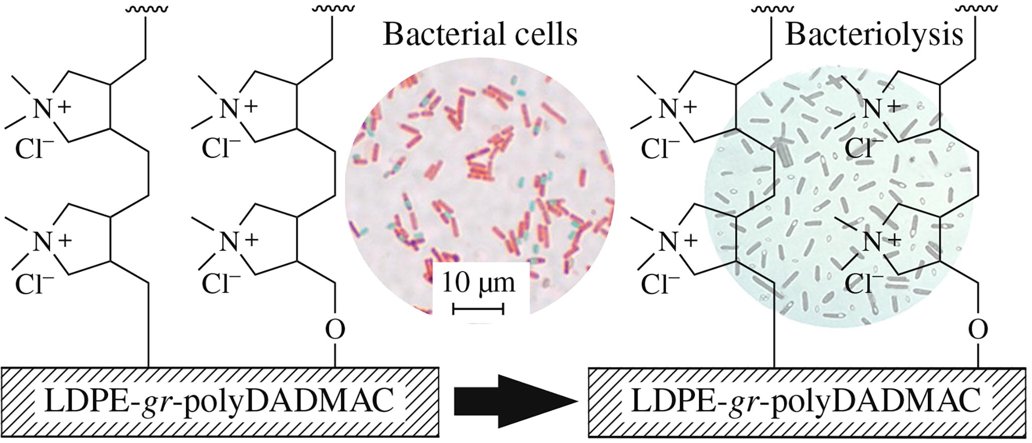 After grafting the N,N-dimethyl-N,N-diallylammonium chloride (DADMAC) polymer to low-density polyethylene (LDPE) using plasma, the polyethylene surface acquired wettability with water. The synthesized graft copolymer turned out to be bactericidal against gram-positive Staphylococcus aureus and gram-negative Escherichia coli.